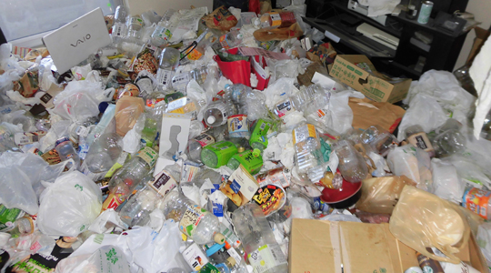 部屋の中はもちろんキッチン、バス、トイレもゴミで埋め尽くされていてゴミの上を踏んで歩く状態です。